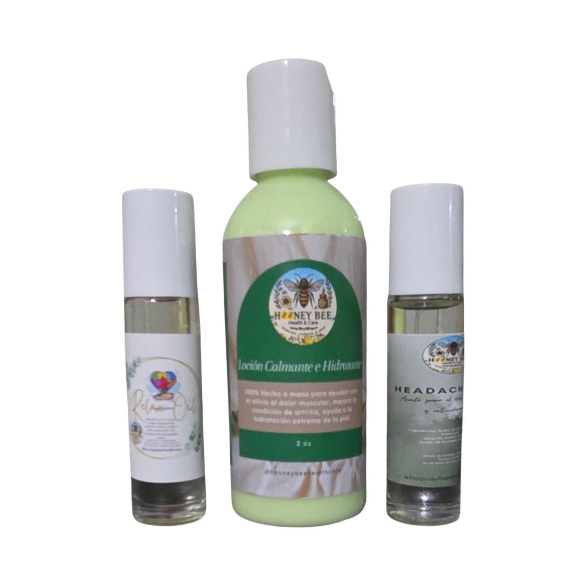 Nuestro kit para sentirse mejor viene con 2 roll on de 10 ml cada uno, el del dolor de cabeza y el relajante, también incluye una crema de 2 oz para el manejo del dolor y la hidratación. A base de aceites esenciales y naturales.